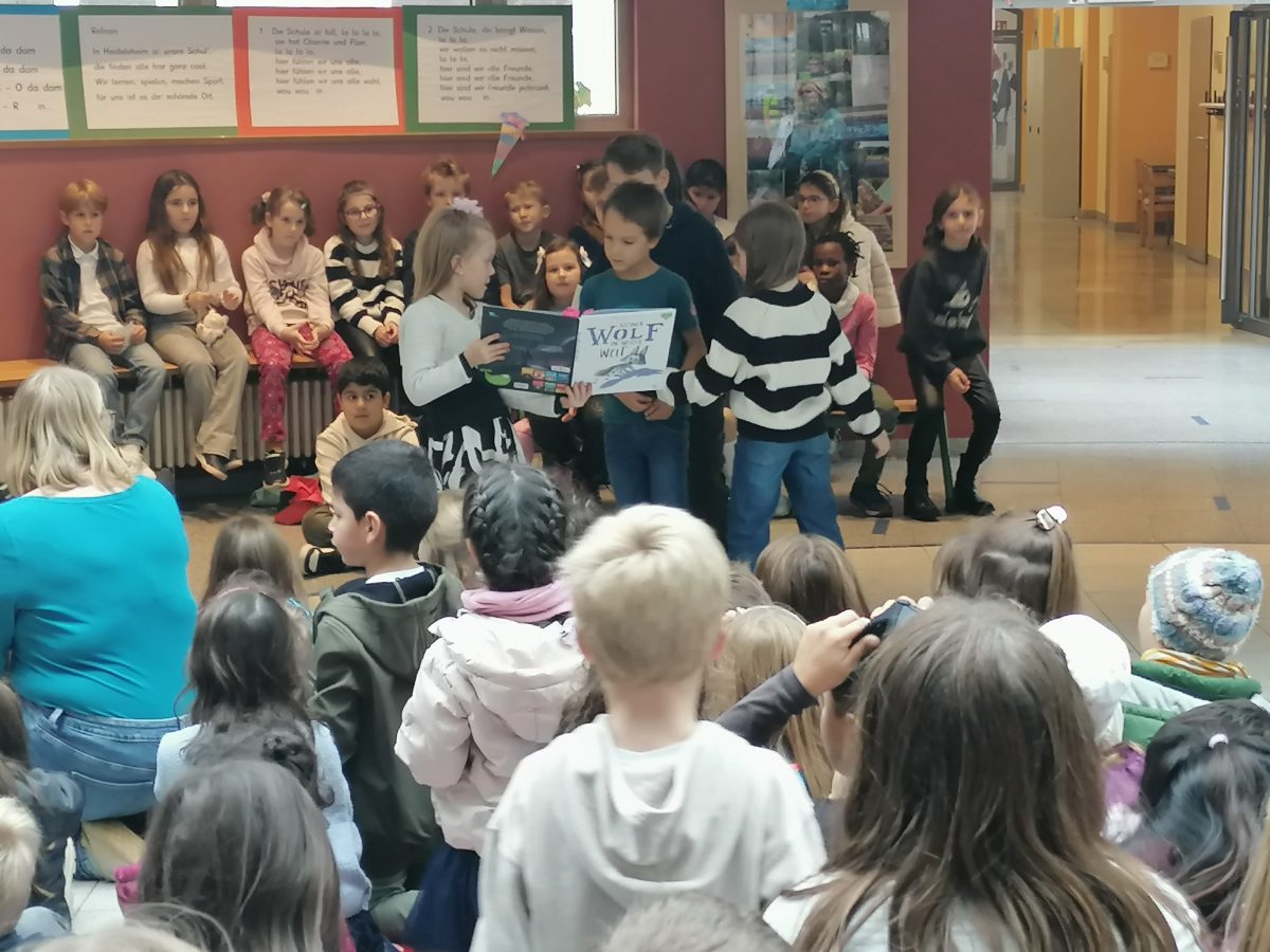 In der Geschichte ging es um den kleinen Wolf Wido, der keine Hilfe annehmen konnte, egal um was es sich handelte. In der klirrenden Kälte der arktischen Nacht war er auf einmal ganz alleine. Er merkte, dass Hilfsbereitschaft anderer wichtig sein konnte und es Mut erfordert, Hilfe anzunehmen. Während der Wir – Versammlung befragten Kinder der Klasse 3b andere zu ihren Erfahrungen, Hilfe anzubieten und Hilfe annehmen zu können.
