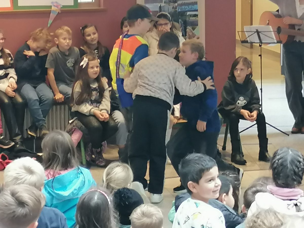 Im Anschluss an die Geschichte stellten sich die neuen Pausenengel vor. Ihr Motto lautet: „Seid ihr verletzt oder habt ihr Streit, die Pausenengel sind stets bereit!“ Pausenengel, das sind Kinder der 4. Klassen, die während der Hofpausen, Kindern helfen und auch Spielangebote machen. Die Pausenengel treffen sich immer donnerstags in der 1. Stunde unter der Leitung von K. Leitz, um Probleme beim Streit schlichten zu klären und um weiter Spielangebote auszuprobieren.